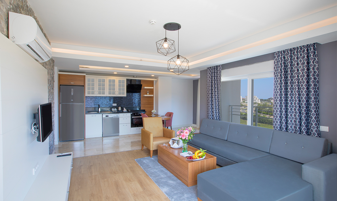 1 yatak odası (1 çift kişilik yatak ve 1 tek kişi yatak)+ 1 salon (2 sofa), ara kapı. Kitchenette.